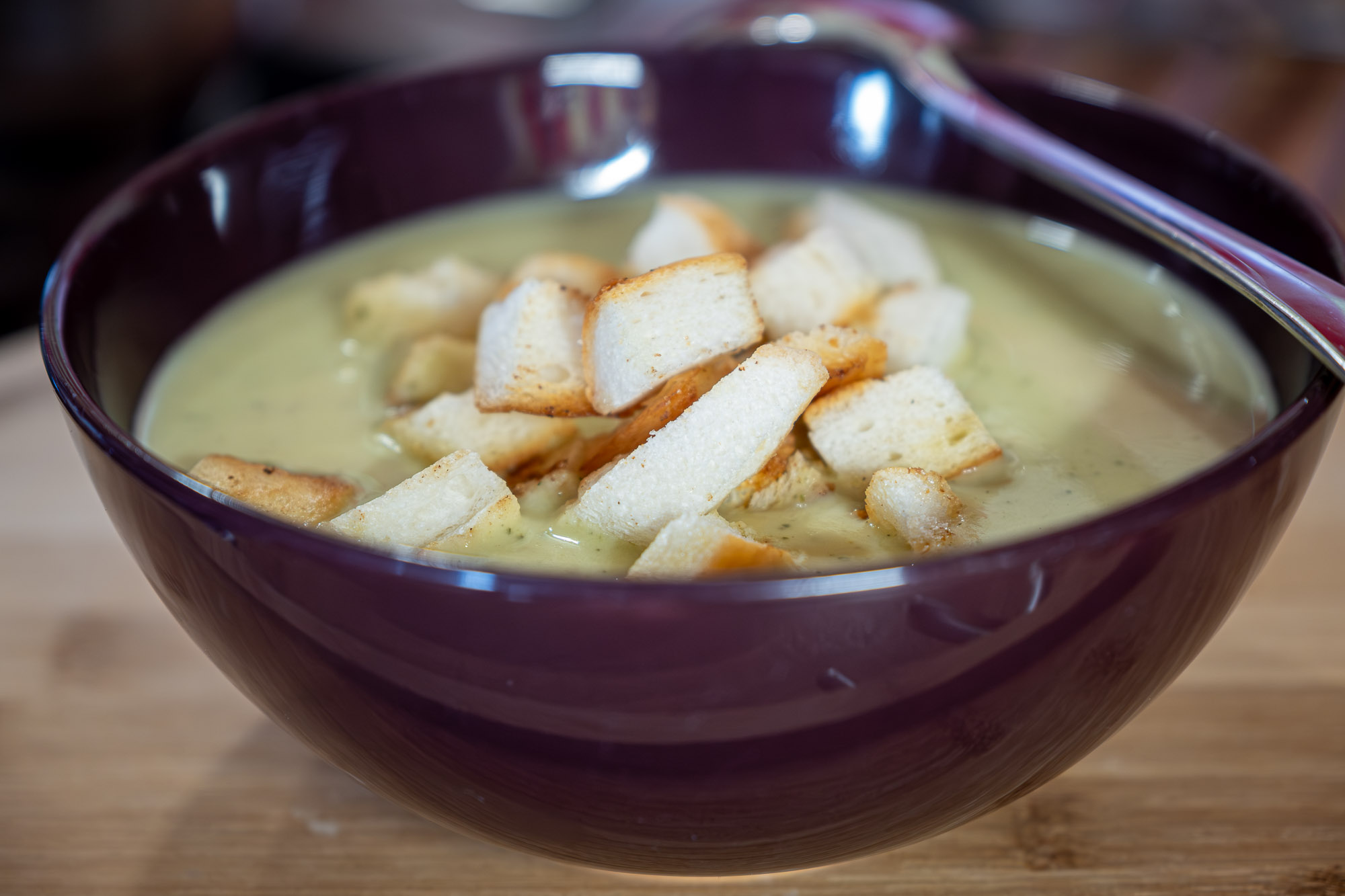 Během vaření polévky si připravte krutony z rohlíku. Nakrájejte si rohlík na kostky a chvíli opékejte na pánvi jen tak na sucho. Jakmile je již rohlík trochu křupavý, přidejte kousek másla a nechte všechny kousky obalit. Pak chvíli opékejte na barvu. Tyto krutony polévku neskutečně doplní, já to tak absolutně miluji.