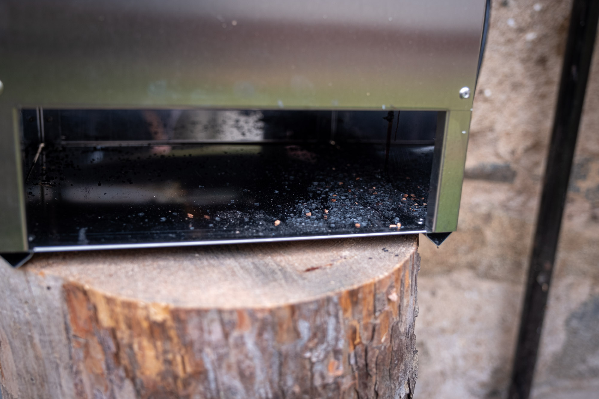Takže pokud se domníváte, že vezmete misku na „popel“, kterou dáváte pod generátor kouře do udírny a dáte ji do ochlazovače pod generátor kouře, tak váz překvapí, že se tam přes ten šuplíček dává dost pitomě. Zjistíte, že musíte misku narvat úplně na stranu, jinak popel padá vedle. A když budete mít v misce kupku, tak si ji při vytahování strhnete, protože otvor na šuplík je nízký.